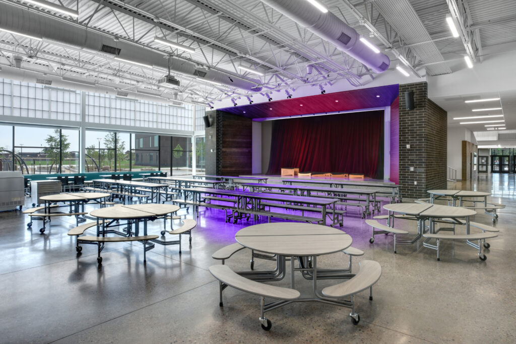 A second-floor “nest” provides a flexible learning and presentation space, offering views of the central plaza below. In the specials wing, the Music Studio features an operable wall that opens to the Cafeteria and Stage, enabling versatile use. The Cafeteria can host both small performances and larger assemblies, with direct access to the main playgrounds for easy monitoring and supervision during recess. Additionally, the Technology and Art Studios are configured for collaborative STEM projects and feature display areas that face the media center, encouraging interaction and integration across disciplines.
