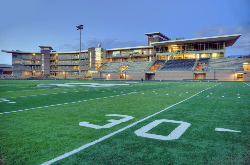 The new four-story building, consisting of community facilities and student residences, was built alongside the existing college track and football field. The community facilities side includes the stadium grandstands, which house game-day locker rooms and concession stands on the main level. The upper floors include an officials and press box, and a two-story multi-use space is planned that includes a restaurant and dining area overlooking the field.
