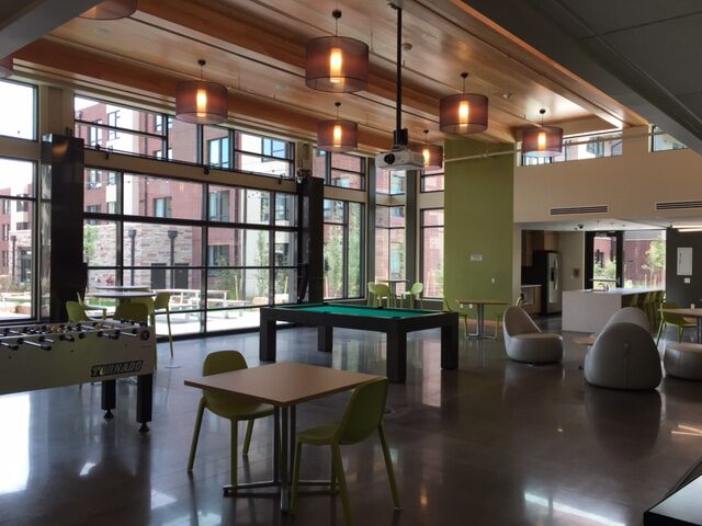 The design intent for the residential complex was to create a global community for students seeking an intercultural living experience. The population includes international students, graduate students, visiting scholars, post-doctoral fellows, and upper-division undergraduates. Design considerations emphasized community-building and accessibility, including walkable connections to campus, accommodations for alternative transportation such as bike racks and nearby transit stops, and future provisions for an on-site car-share program aligned with CSU’s sustainability goals.