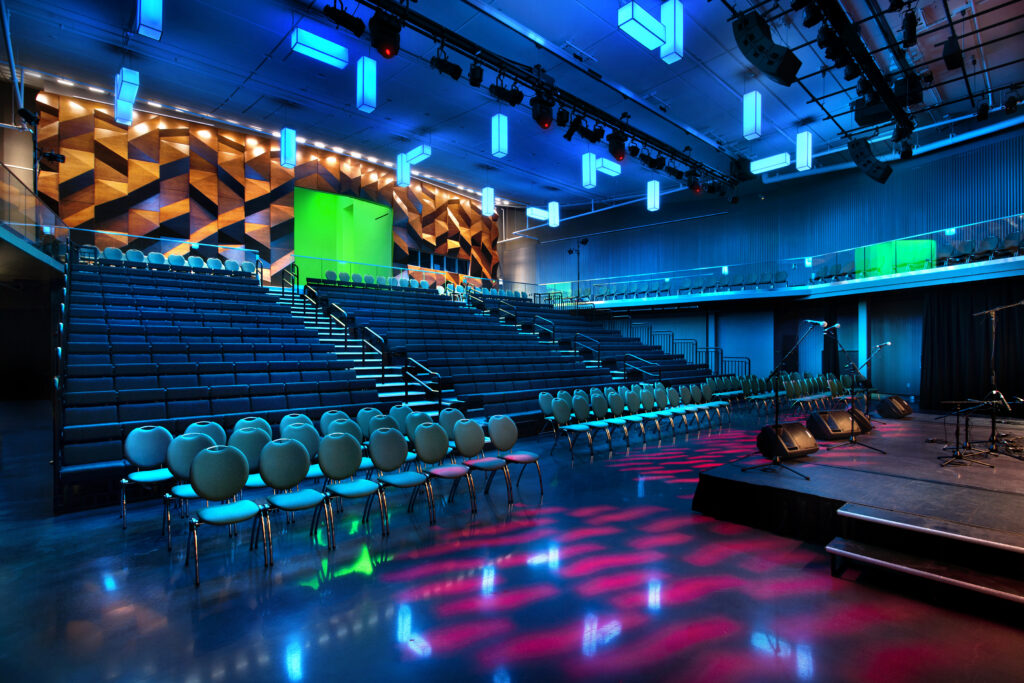 A major highlight of the renovation is the dynamic, energy-efficient LED lighting system, which reduced wattage consumption by 33 percent below code allowances. The design was strongly influenced by the decision to preserve the existing patterned concrete ceiling. Decorative luminaires were mounted at existing locations, and their glowing box forms were chosen to complement the original ceiling patterns. Because of the theater’s need for flexibility during performances and events, these fixtures utilize color-changing LED technology, allowing the space to be tuned for mood, branding, or theatrical impact.