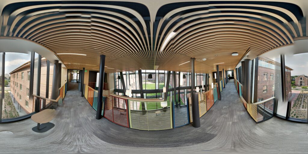 Architectural lighting design played a significant role in shaping the building’s character. CRA completed multiple rounds of photometric modeling to coordinate light levels, fixture placement, and visual experience with the University’s design standards. The result is a residence hall that blends energy-conscious lighting with comfortable living spaces and active community areas.