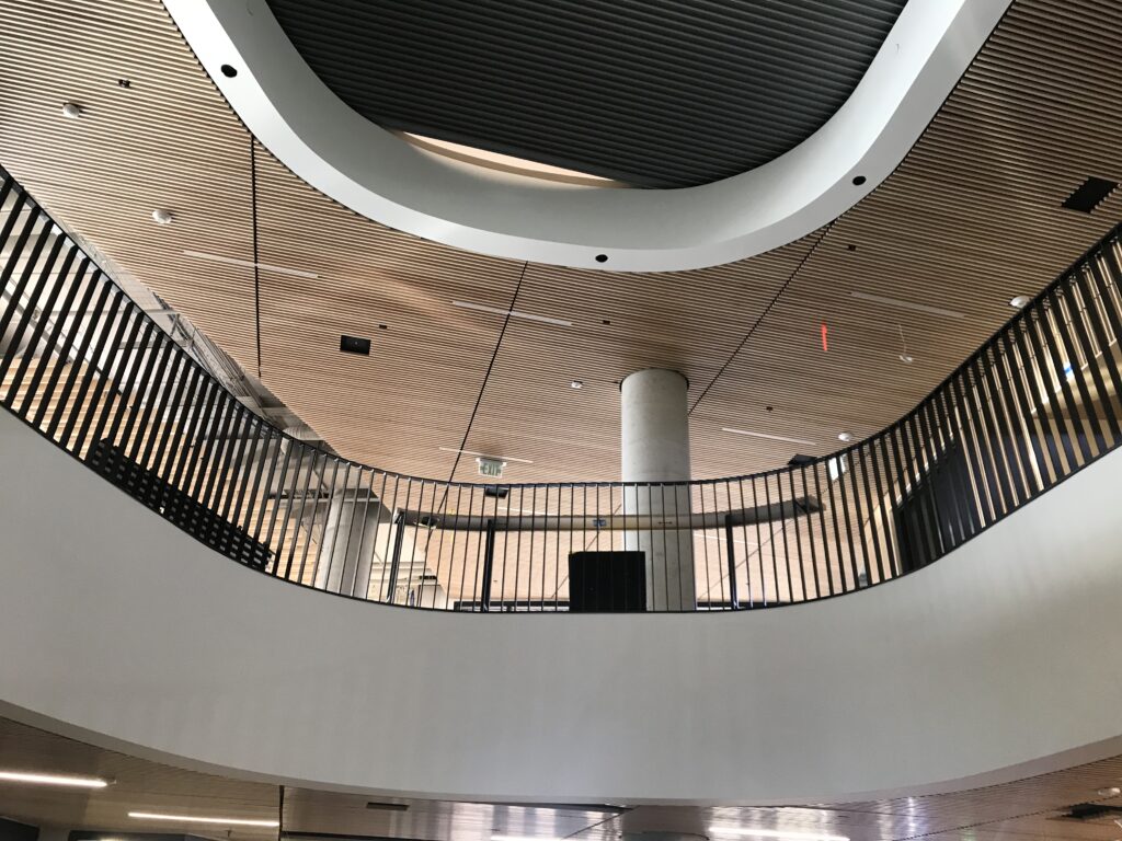 Custom air handling units with supply and return fan arrays serve the building, using indirect direct evaporative cooling and heat recovery to support energy efficiency. Air distribution includes conventional overhead systems for the food service level and displacement ventilation for the upper floors to enhance comfort and air quality.